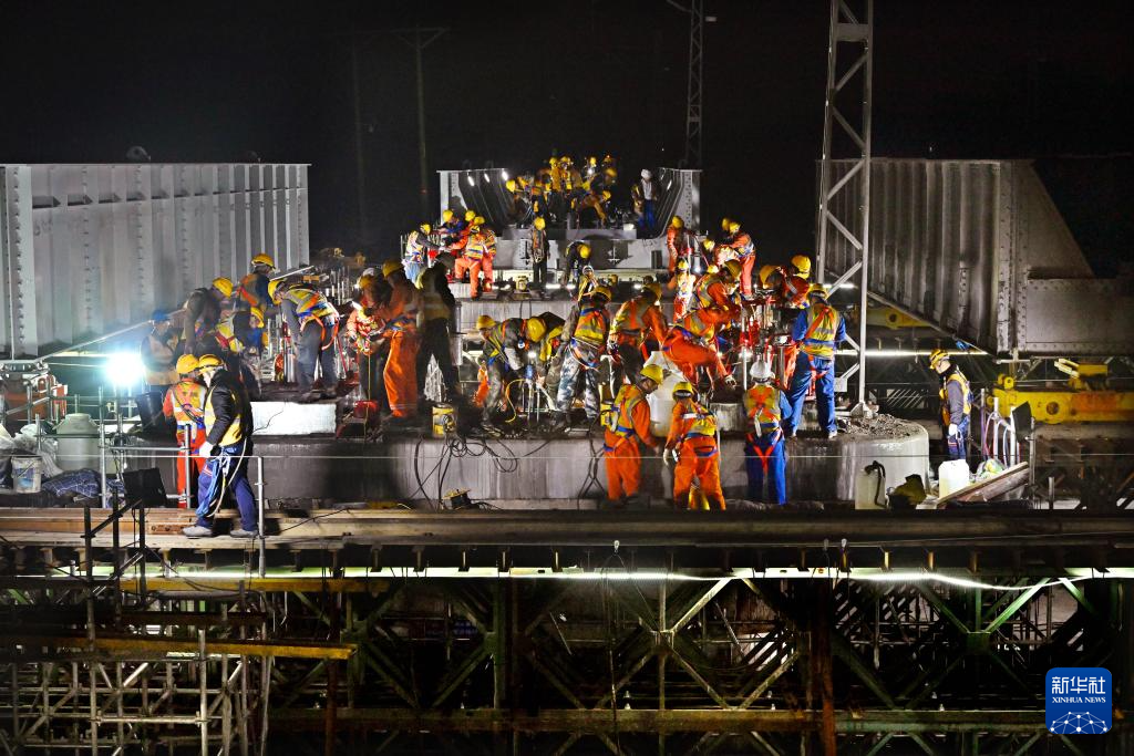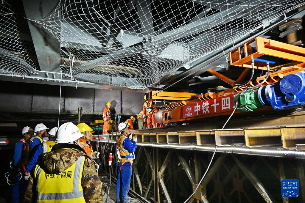 11月14日,中铁十四局施工人员在换梁现场作业。