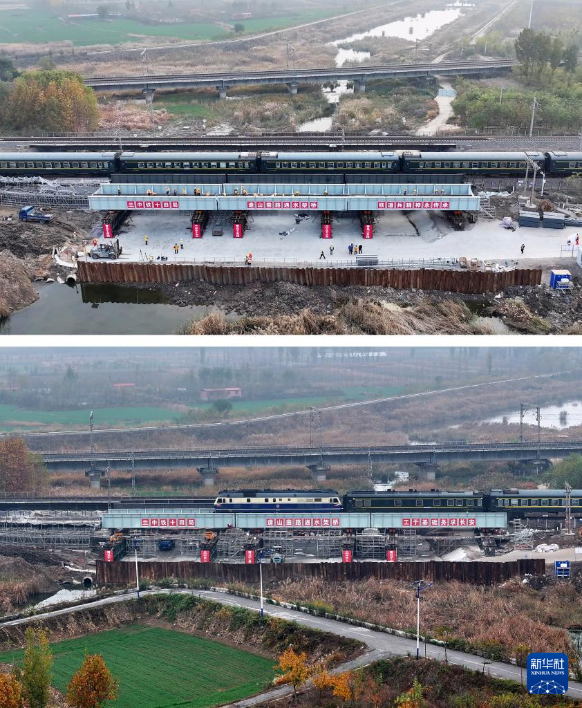 拼版照片:胶济铁路桃源河铁路桥钢梁更换前(11月13日摄);胶济铁路桃源河铁路桥钢梁更换后(11月15日摄)。