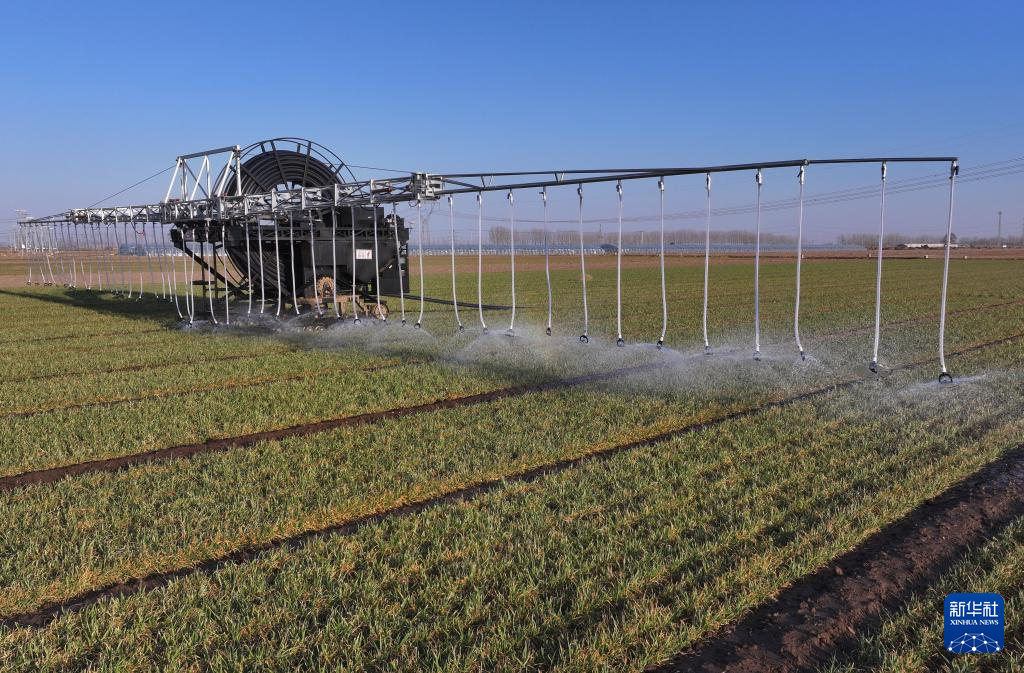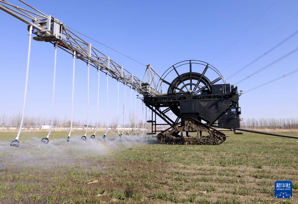3月17日,一台自走式水肥一体农田喷灌设备在河北省唐山市丰南区东田庄镇的冬小麦田间进行喷灌作业。