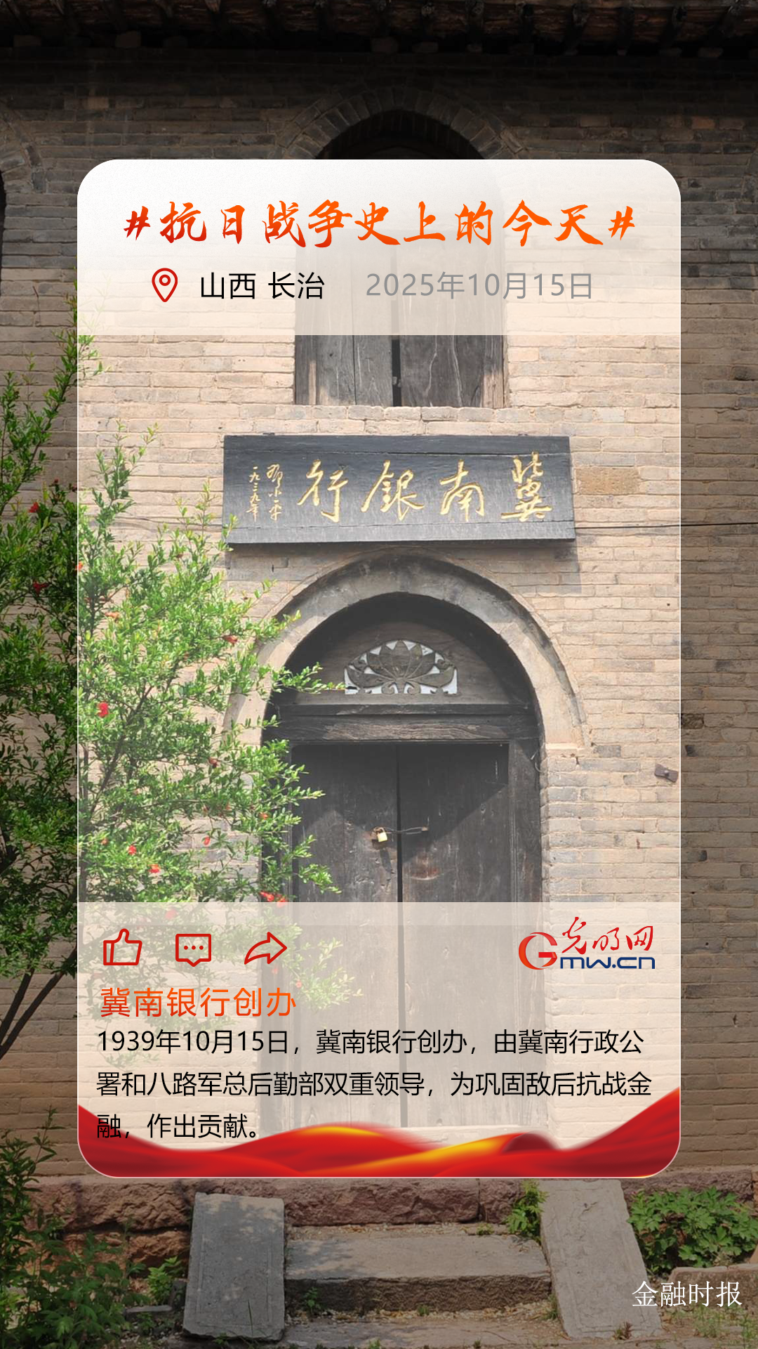 1939年10月15日,冀南银行创办,为巩固敌后抗战金融,作出贡献。
