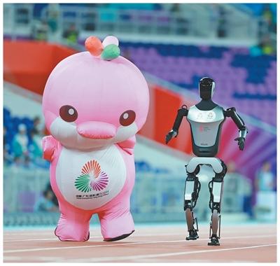 十五运会赛场,吉祥物与机器人互动。本报记者 陶相安摄