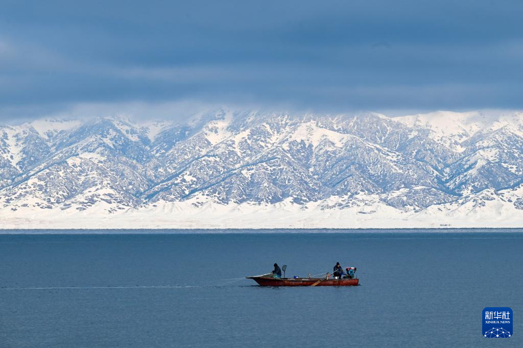 一条小船在赛里木湖中驶过(12月16日摄)。