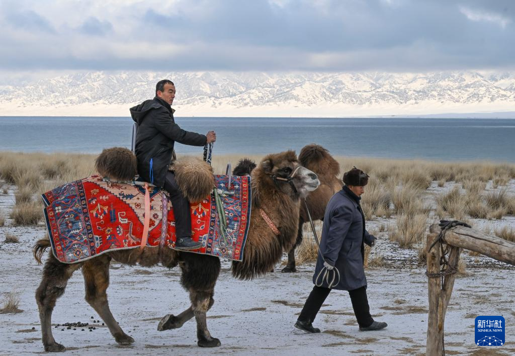 牧民骑着骆驼在赛里木湖边招揽生意(12月15日摄)。