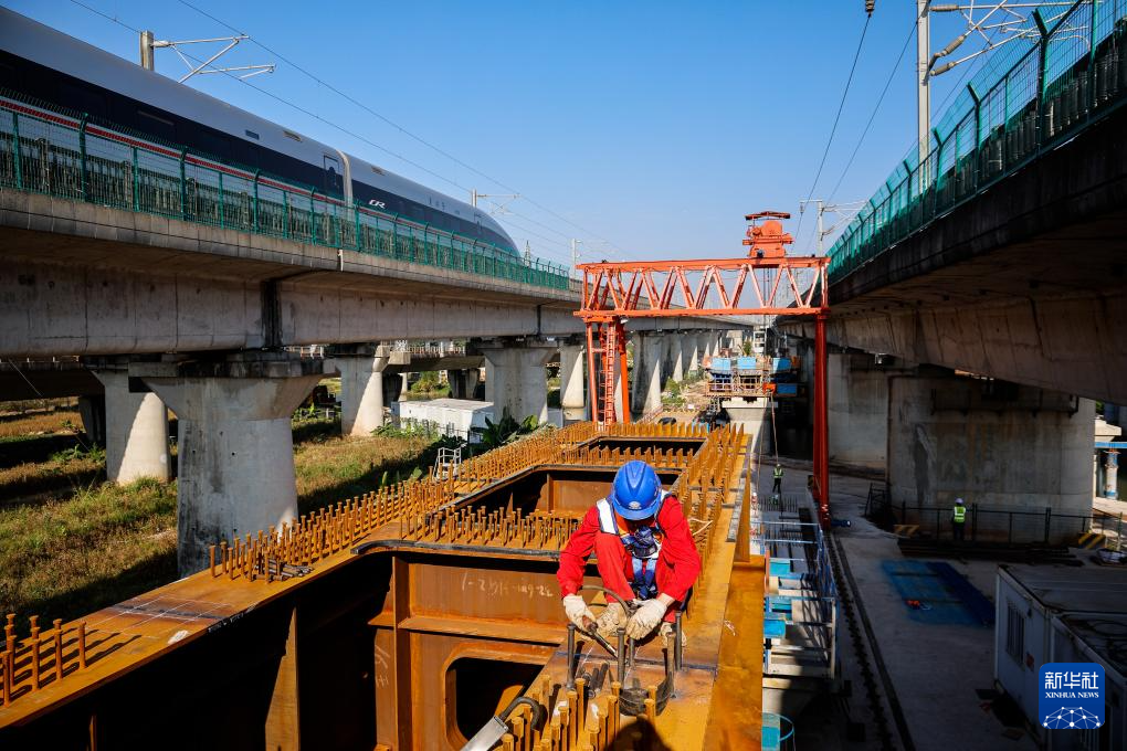12月21日,施工人员在广南联络线广州南左右线大桥钢混组合梁上焊接。