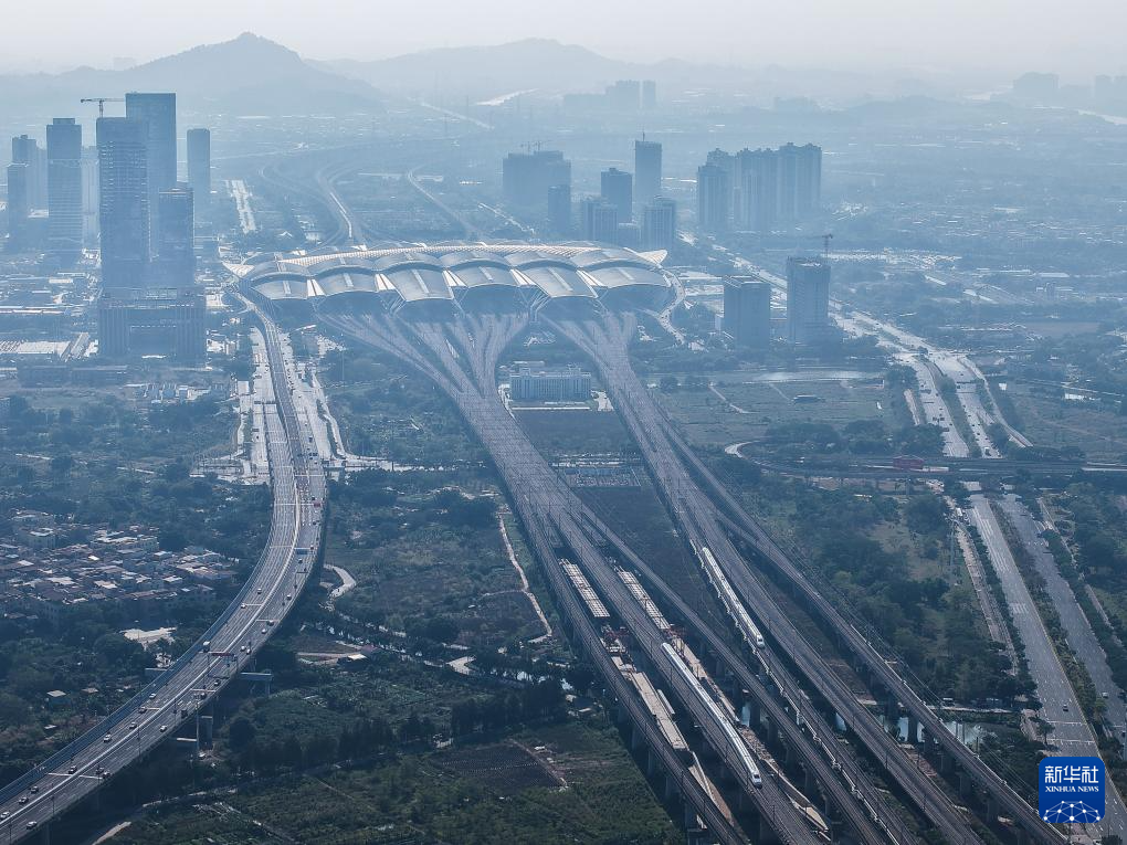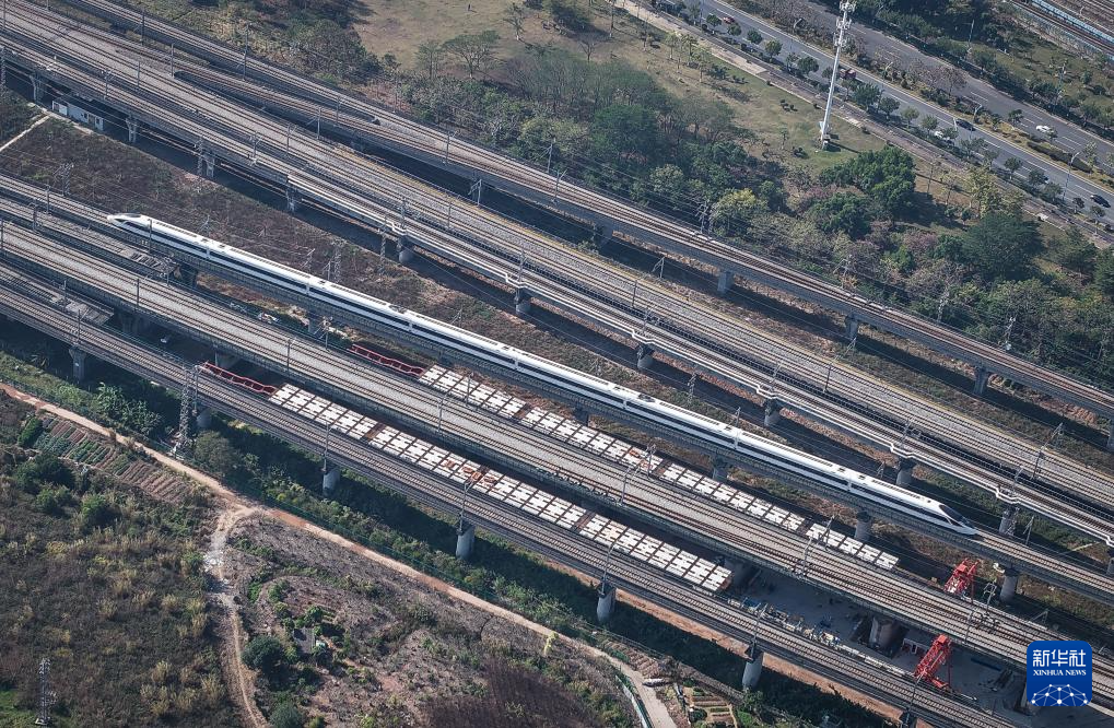 12月21日,列车行经正在施工的广南联络线广州南左右线大桥(无人机照片)。