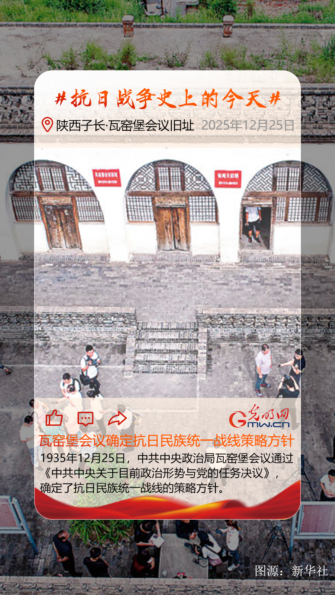 1935年12月25日,中共中央政治局瓦窑堡会议通过《中共中央关于目前政治形势与党的任务决议》,确定了抗日民族统一战线的策略方针。