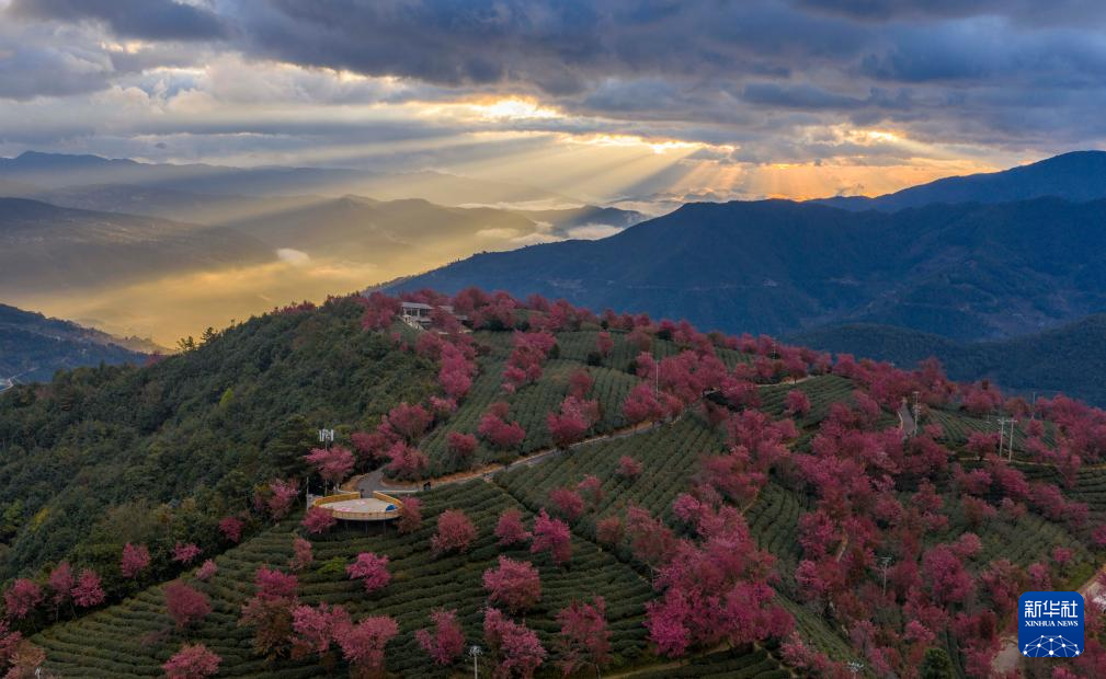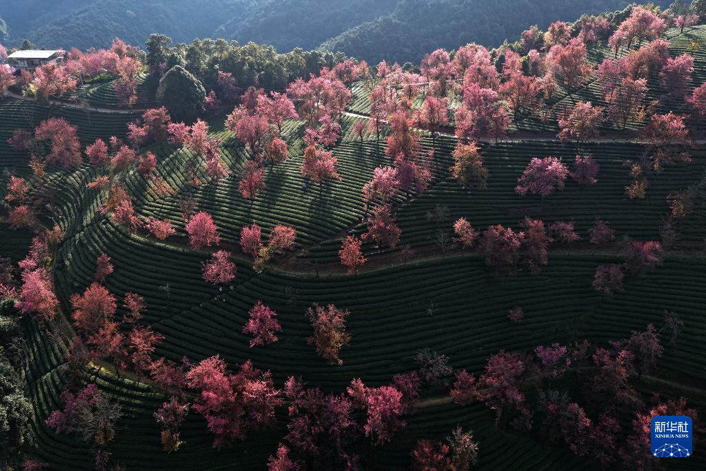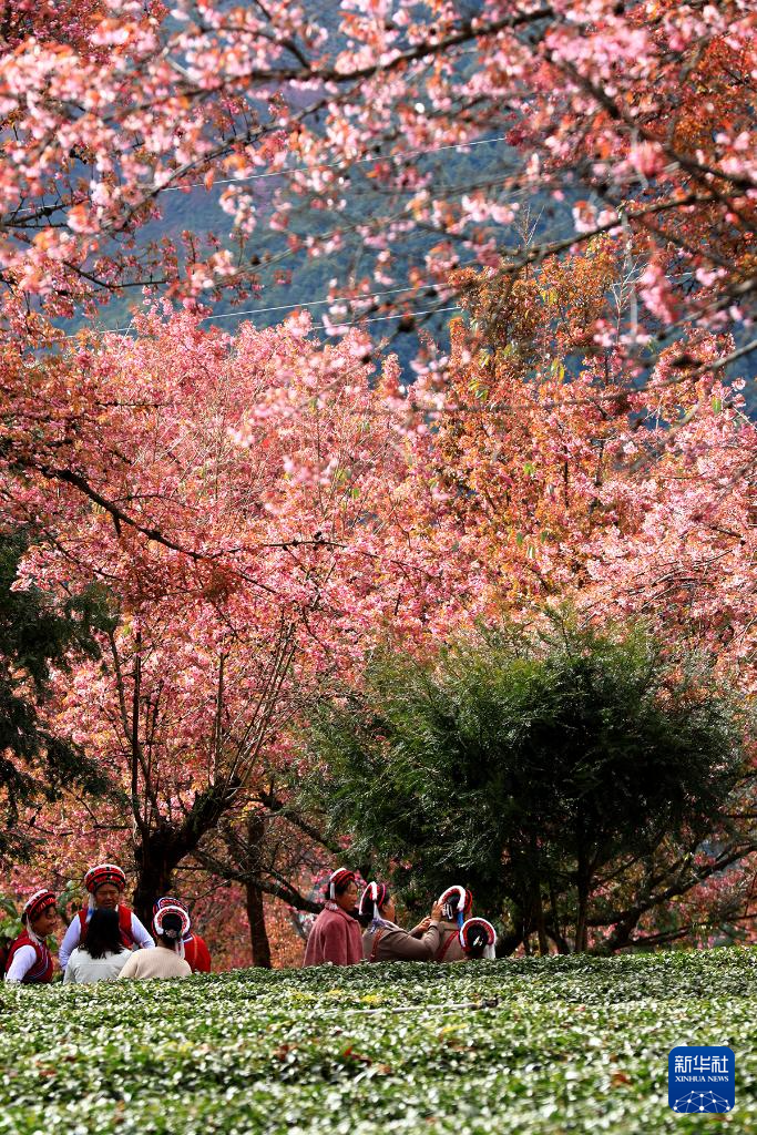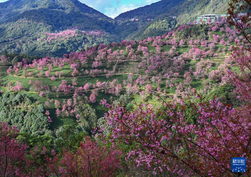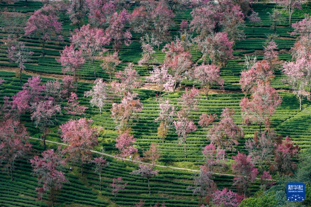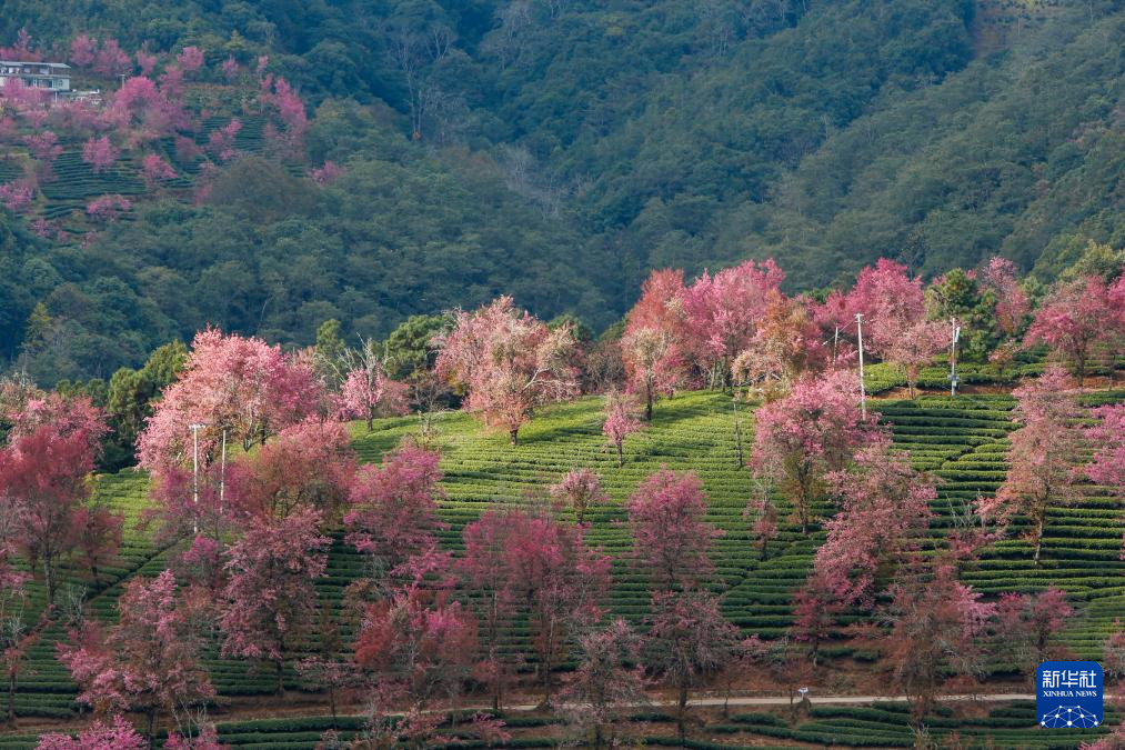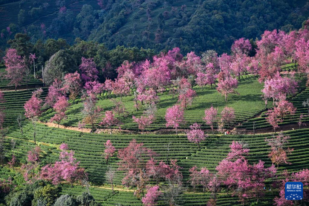进入12月,云南省大理白族自治州南涧彝族自治县无量山樱花谷的冬樱花陆续绽放,与茶园、云海构成一幅美丽的山水画卷。