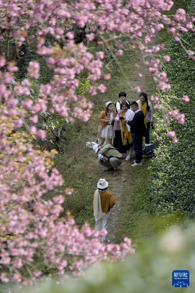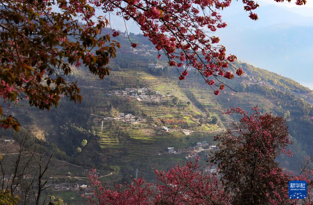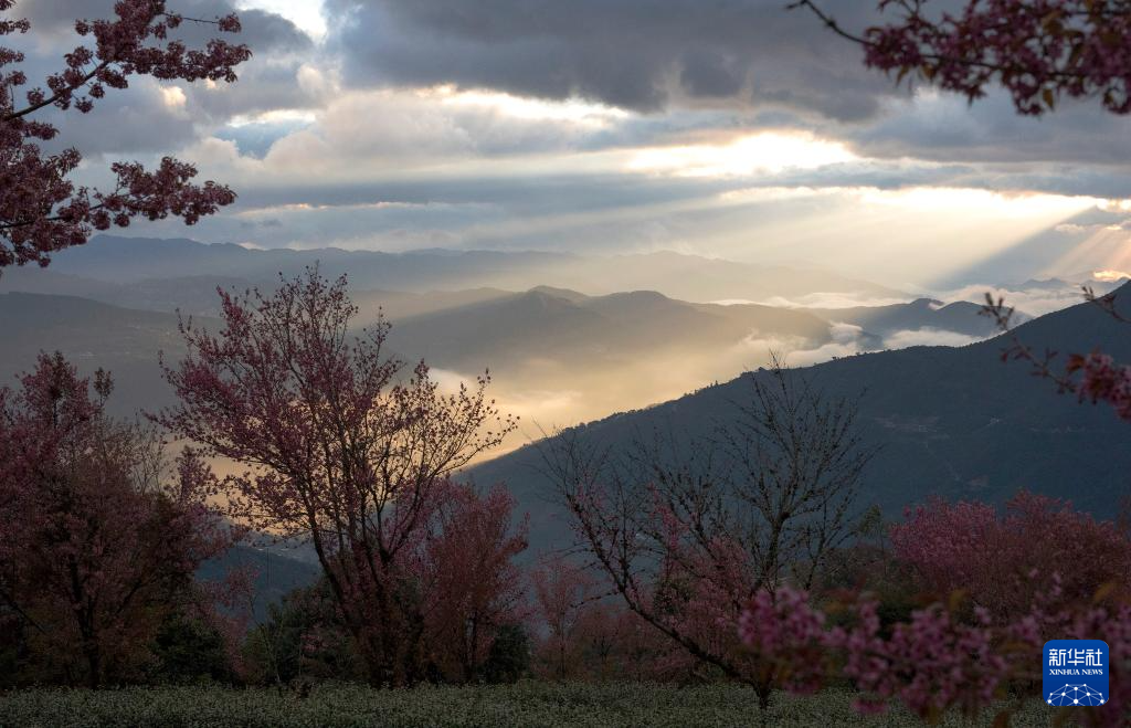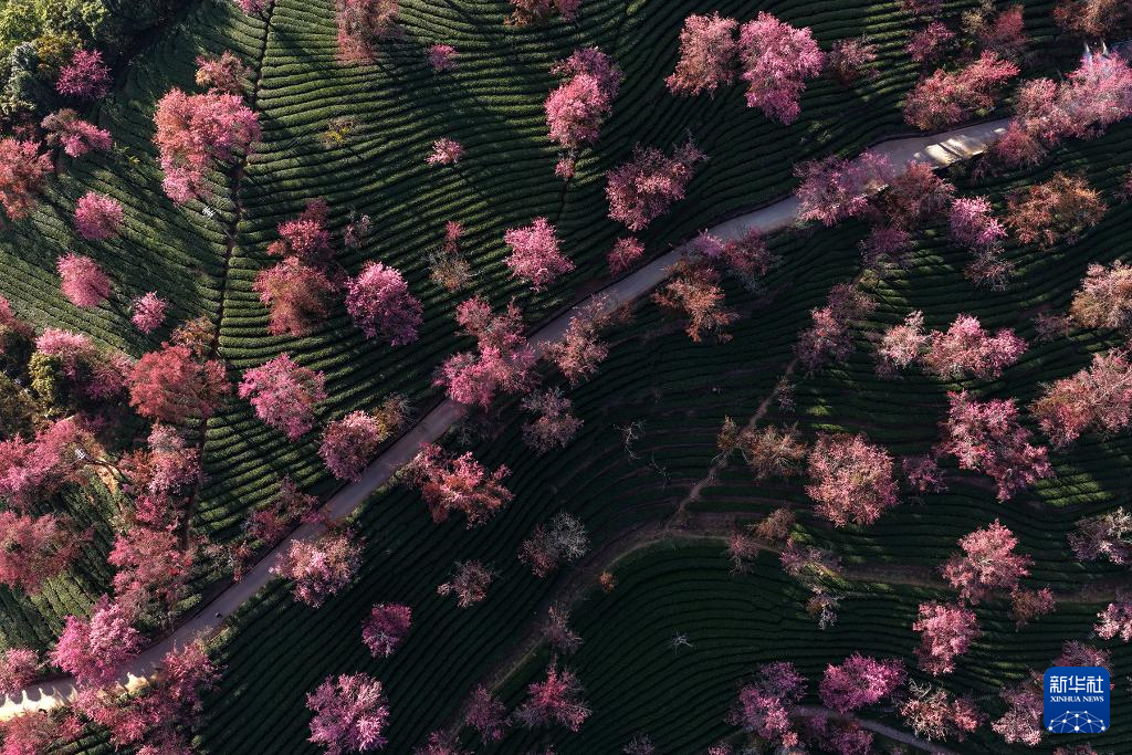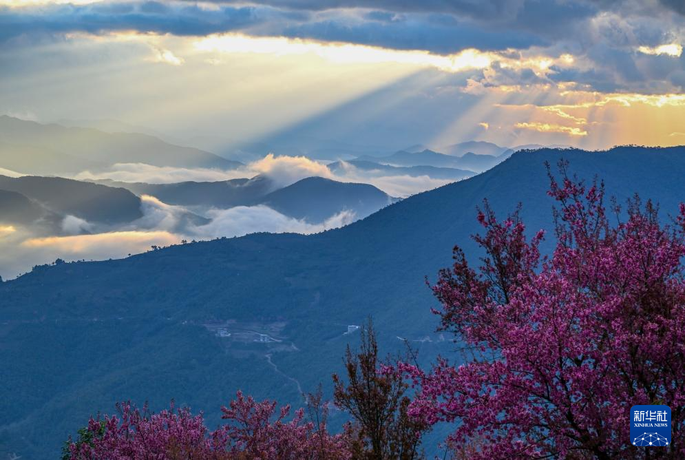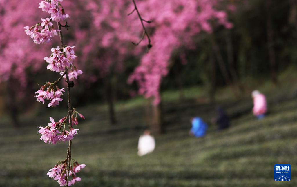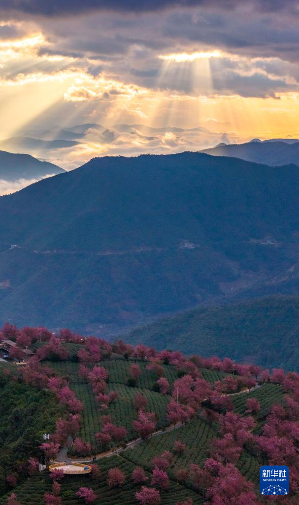 进入12月,云南省大理白族自治州南涧彝族自治县无量山樱花谷的冬樱花陆续绽放,与茶园、云海构成一幅美丽的山水画卷。