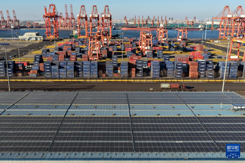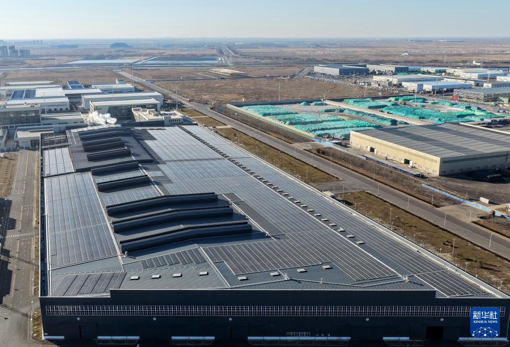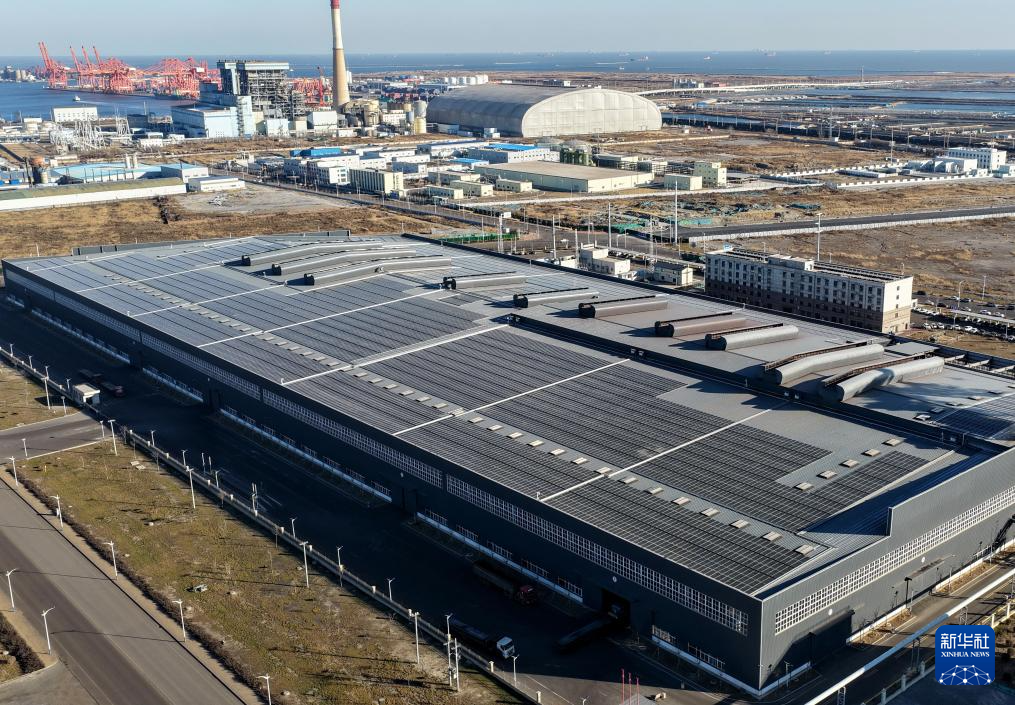这是12月25日拍摄的唐山市海港经济开发区一家企业厂房屋顶上的光伏发电板(无人机照片)。