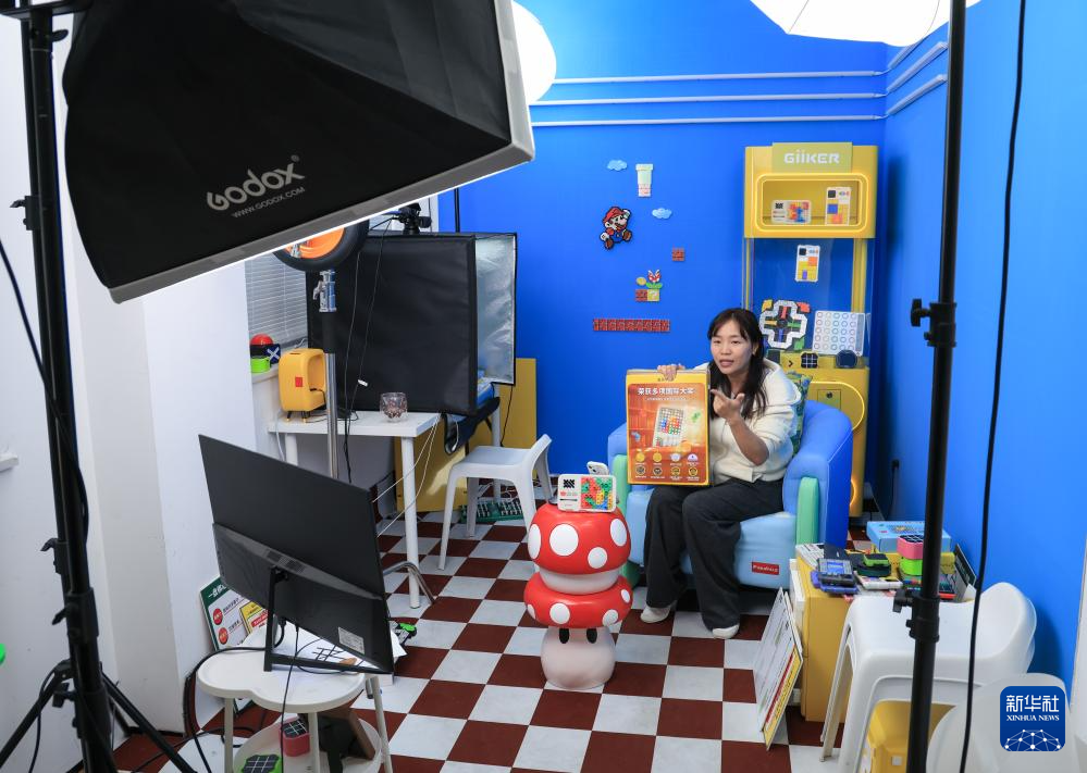 10月29日,在广东佛山顺德的广东工业设计城,计客主播在直播平台介绍超级积木玩具。