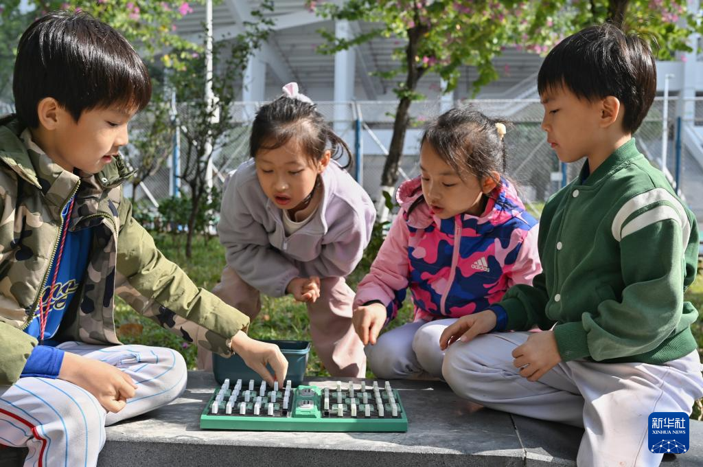 12月27日,在广州一体育场外,几名儿童在一起玩计客智能军棋玩具。