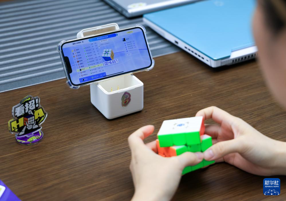 10月29日,在广东佛山顺德,淦源科技的员工参加企业内部举行的魔方竞速比赛。