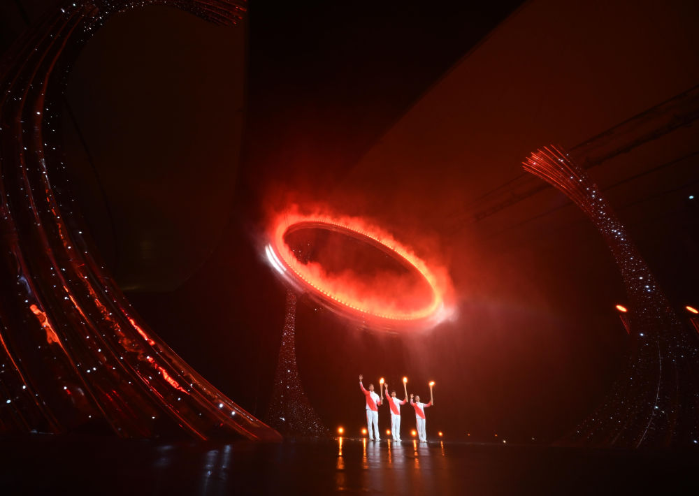 2025年11月9日,第十五届全国运动会开幕式在广东奥林匹克体育中心举行。这是火炬手苏炳添(中)、张家朗(左)、李祎点燃主火炬后向观众致意。新华社记者肖艺九 摄