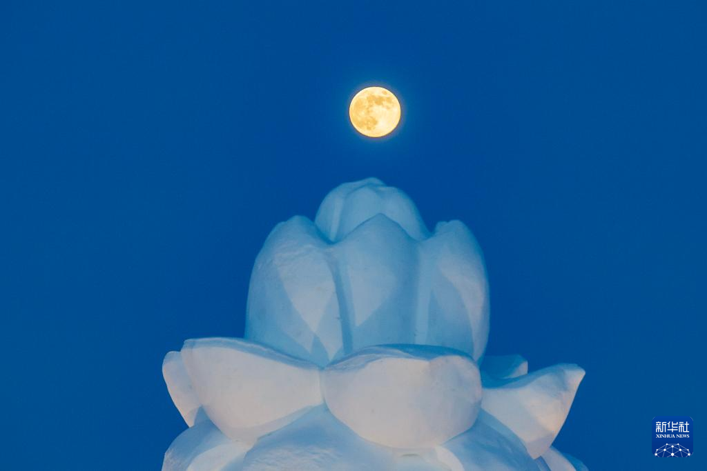 1月3日在黑龙江省哈尔滨市冰雪大世界园区拍摄的月亮。