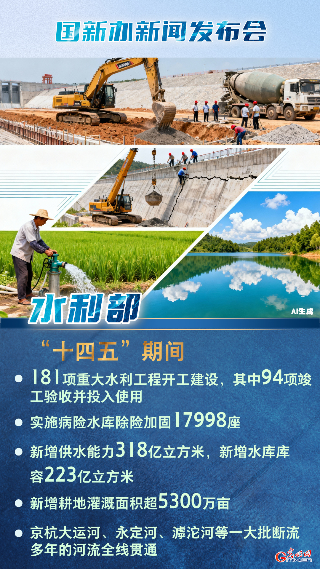 据介绍,“十四五”期间,181项重大水利工程特别是黄河古贤、南水北调中线引江补汉、淮河入海水道二期等论证多年的战略性工程开工建设,较“十三五”期间多65项,94项重大水利工程竣工验收并投入使用,实施病险水库除险加固17998座,系统治理中小河流3741条,新增供水能力318亿立方米,新增水库库容223亿立方米,新增耕地灌溉面积超5300万亩,京杭大运河、永定河、滹沱河等一大批断流多年的河流全线贯通。“十四五”期间,全国完成水利建设投资5.68万亿元,2022年以来连续4年完成投资超过了1万亿元。