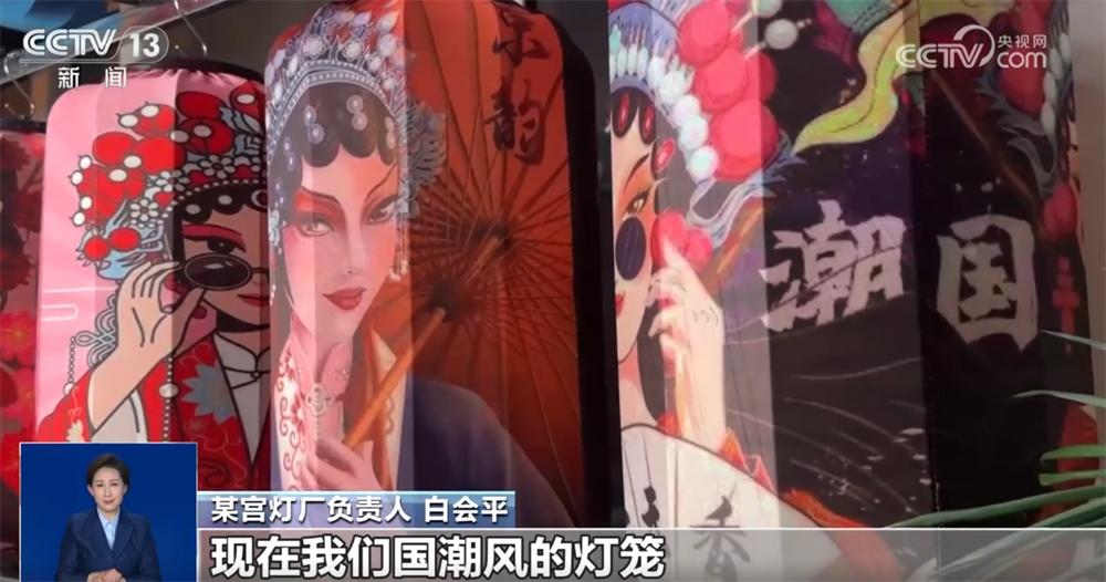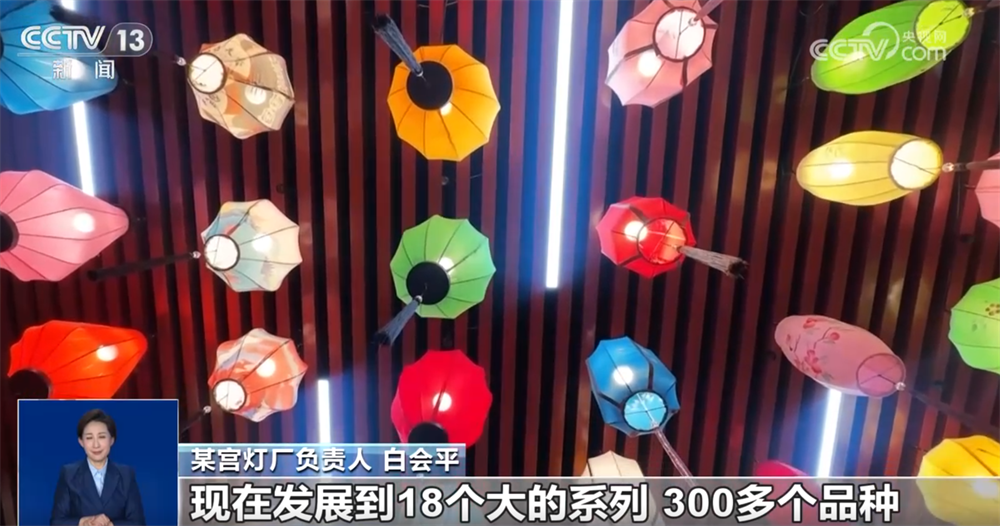 某宫灯厂负责人白会平:通过跟大专院校合作,研发新的产品,每年都得有一个新的突破。现在我们国潮风的灯笼特别受年轻消费群体的喜欢。原来我们是单一的几个品种,现在发展到18个大的系列、300多个品种,而且根据客户的要求还可以量身定做。
