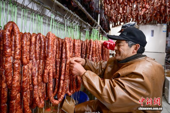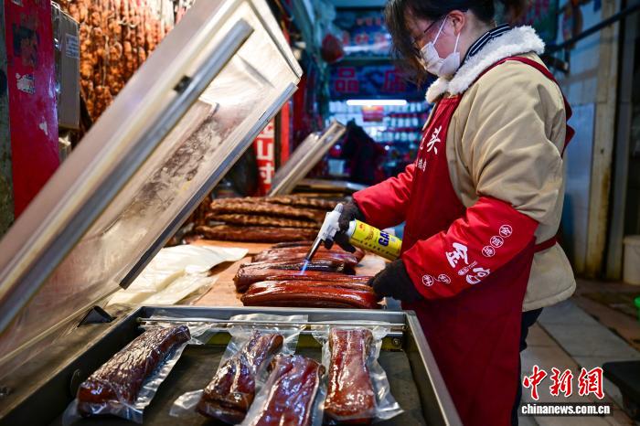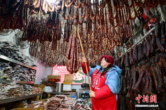 1月14日,春节临近,四川成都青羊区新开寺街腊味飘香。中新社记者 刘忠俊 摄