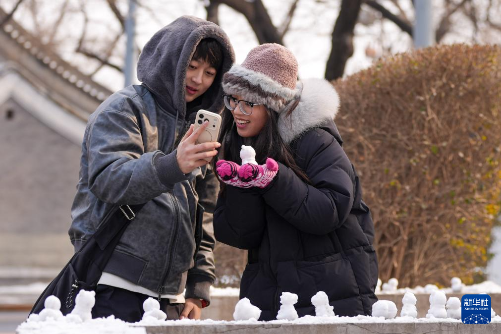 这是1月18日在北京景山东街拍摄的路边的“迷你”雪人。