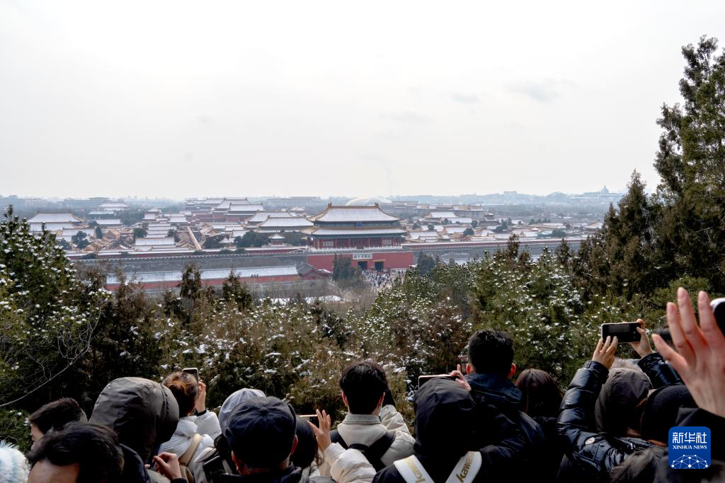 1月18日,人们在北京景山公园观赏、拍摄故宫雪景。