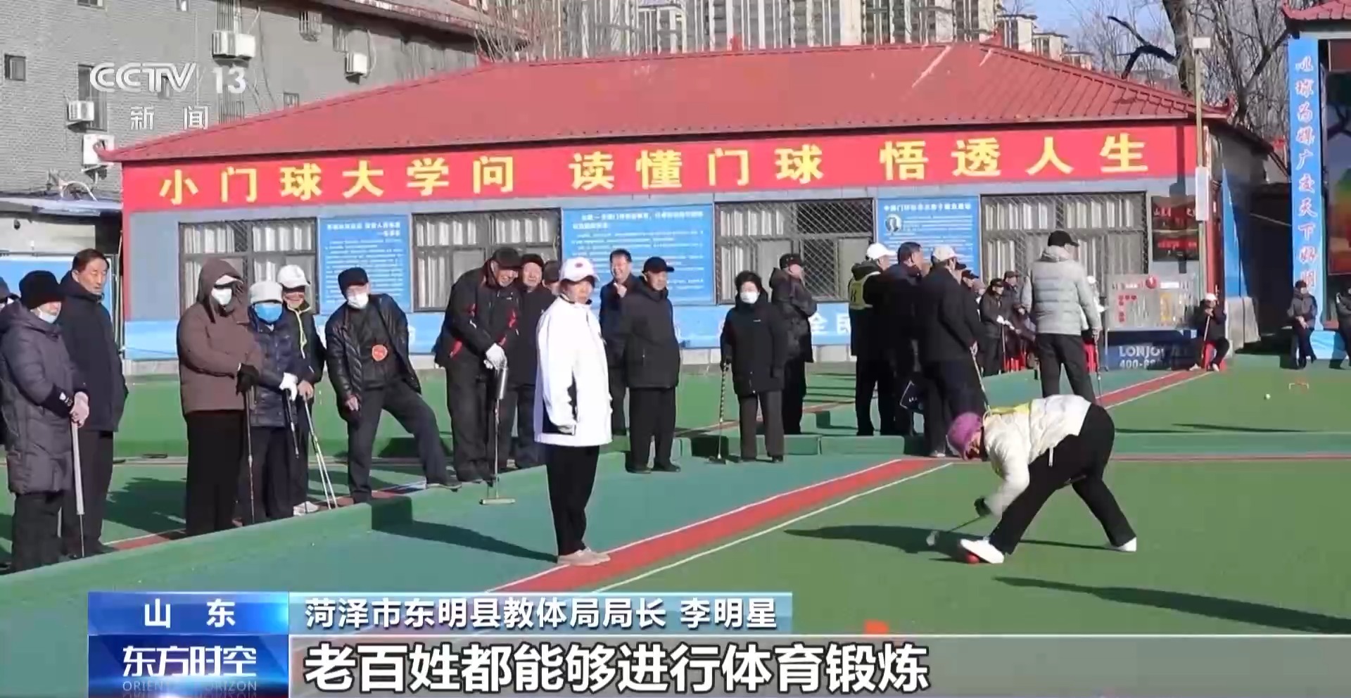 菏泽市东明县教体局局长李明星:17片连在一起的标准化门球场,其中8片有雨棚,下雨天、刮风天,老百姓都能够进行体育锻炼。