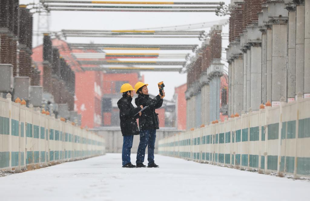 1月19日,在河南省焦作市温县220千伏拳乡变电站,工作人员利用红外测温仪对供电设备进行测温测负。新华社发(黄福兴摄)