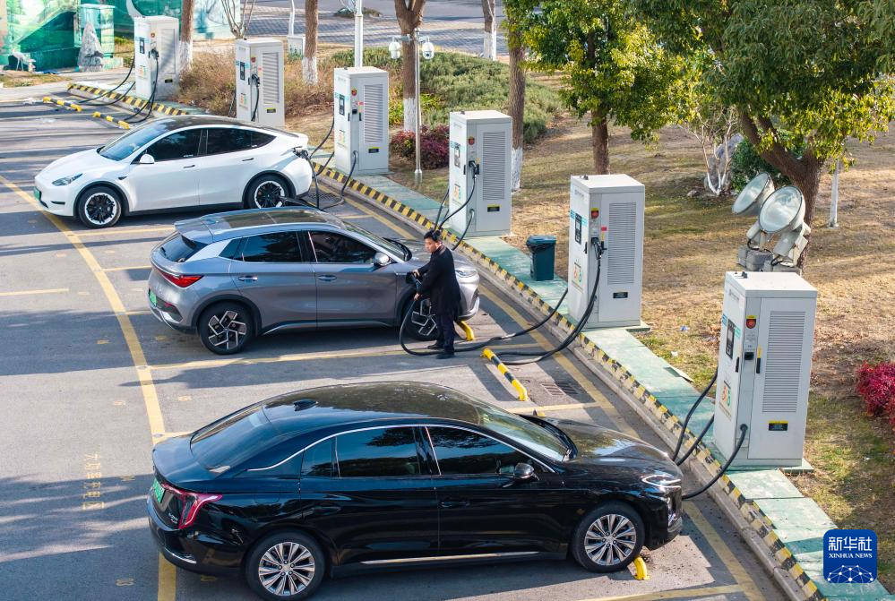 1月22日,车主在江苏泰州电暖流城市服务中心电动汽车快充站内为车辆充电(无人机照片)。
