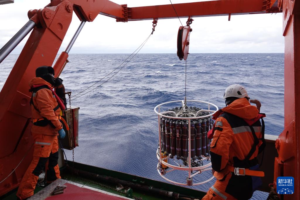 北京时间1月24日,“雪龙”号大洋队队员邢磊在舯部甲板采集从水下4000米获取的海水样品。