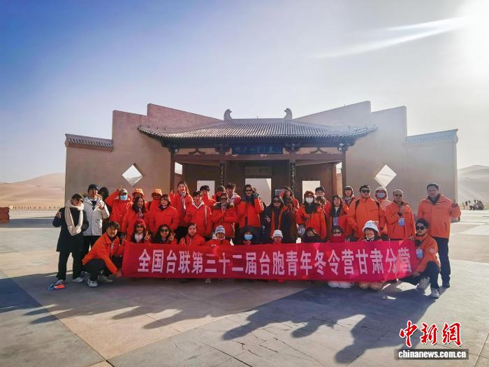 1月23日,全国台联第三十二届台胞青年冬令营甘肃分营营员在敦煌鸣沙山月牙泉合影留念。申志波 摄