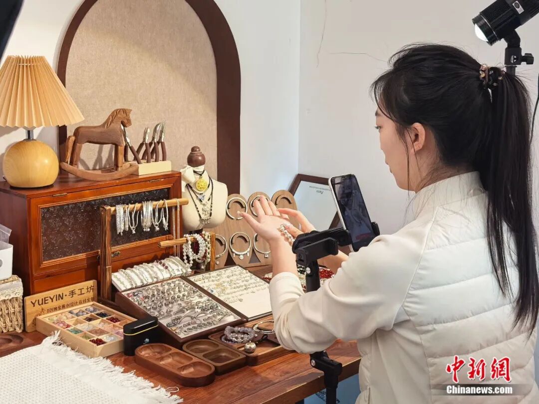 在中国银都文创园里,昼夜不息的直播间成了新产业地标。主播崔雪飘在镜头前娴熟展示银饰,她是返乡创业的大学生,如今已是园区明星主播。“去年七夕单场直播,营业额突破400万元。”她笑着说。