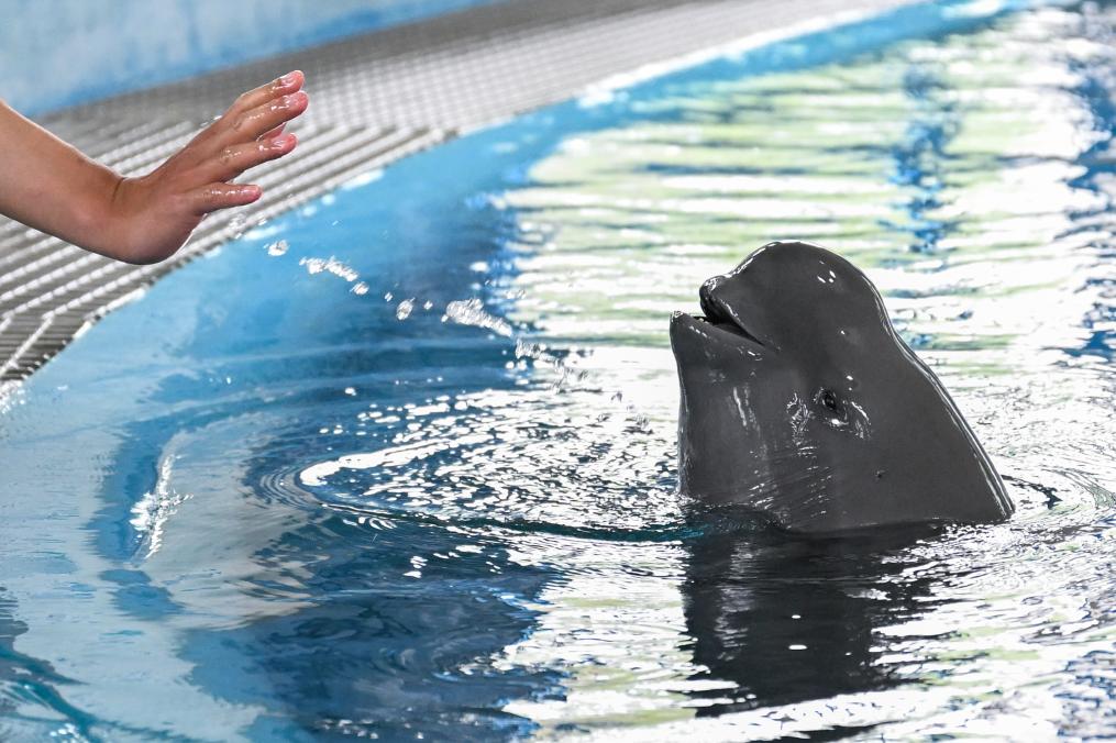 在位于湖北省武汉市的中国科学院水生生物研究所长江江豚繁育研究中心,训练员给长江江豚喂食。新华社记者 杜子璇 摄