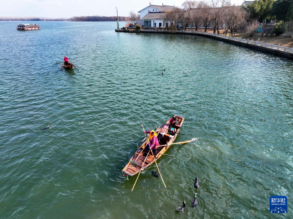 1月31日,渔民在泰州市姜堰区溱湖湾用鸬鹚进行捕鱼(无人机照片)。