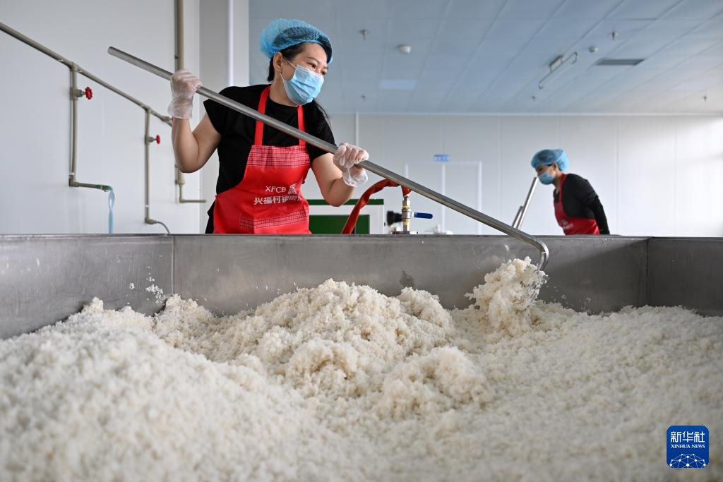1月28日,文昌溪北邦兴食品科技有限公司糟粕醋加工厂的工作人员在给蒸熟的大米降温。大米是制作糟粕醋的主要原材料。