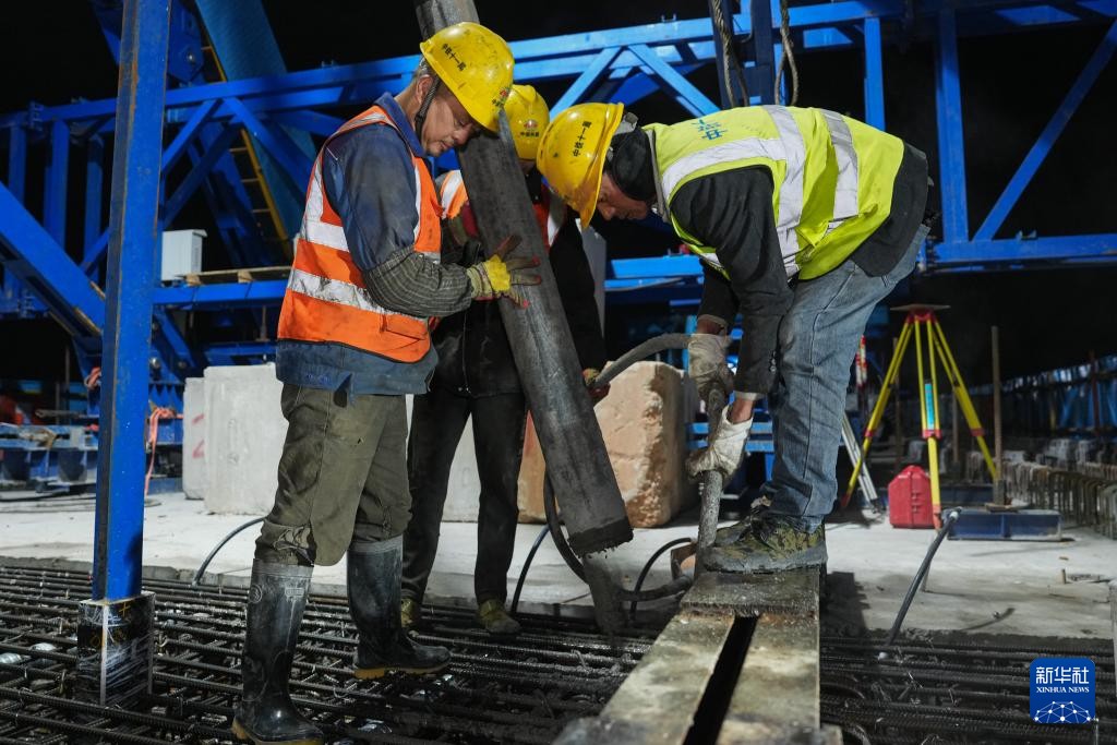 2月3日凌晨,建设者在衢丽铁路衢江特大桥跨芝溪连续梁合龙施工现场作业。