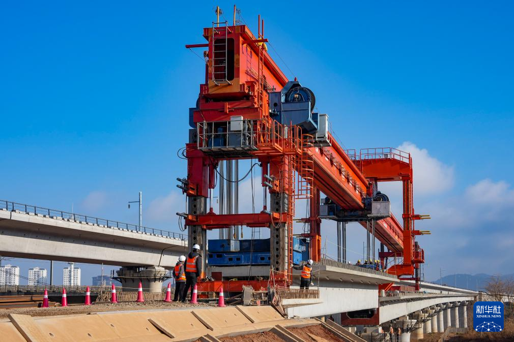 这是2月3日拍摄的渝昆高铁最后一榀箱梁架设施工现场。