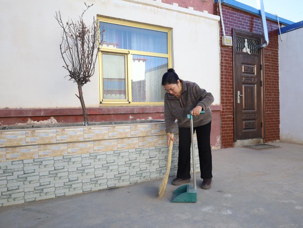 1月22日,长江源村村民小马正在打扫自家院子。新华社记者解统强摄