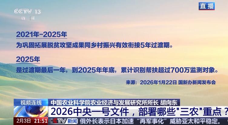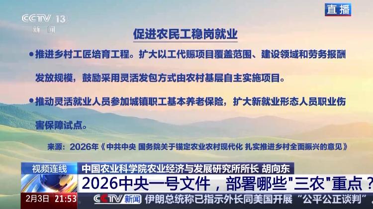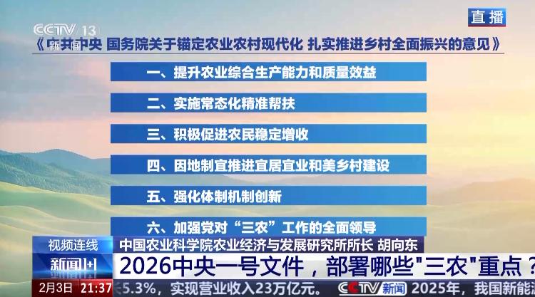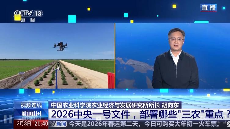 2026年中央一号文件2月3日发布,对锚定农业农村现代化、扎实推进乡村全面振兴进行了部署。目前,我国粮食产量已连续两年稳定在1.4万亿斤以上,如何提升农业综合生产能力和质量效益成为重中之重。除了稳定发展粮油生产,文件明确提出加强农业关键核心技术攻关和科技成果高效转化应用。与此同时,文件将实施常态化精准帮扶单独列为一项重要工作任务,强调要培育壮大县域富民产业、促进农民工稳岗就业。保障粮食安全如何再升级?现代农业科技要如何提高效能?常态化精准帮扶机制如何有效建立?《新闻1+1》本期节目连线中国农业科学院农业经济与发展研究所所长胡向东,进行解读。