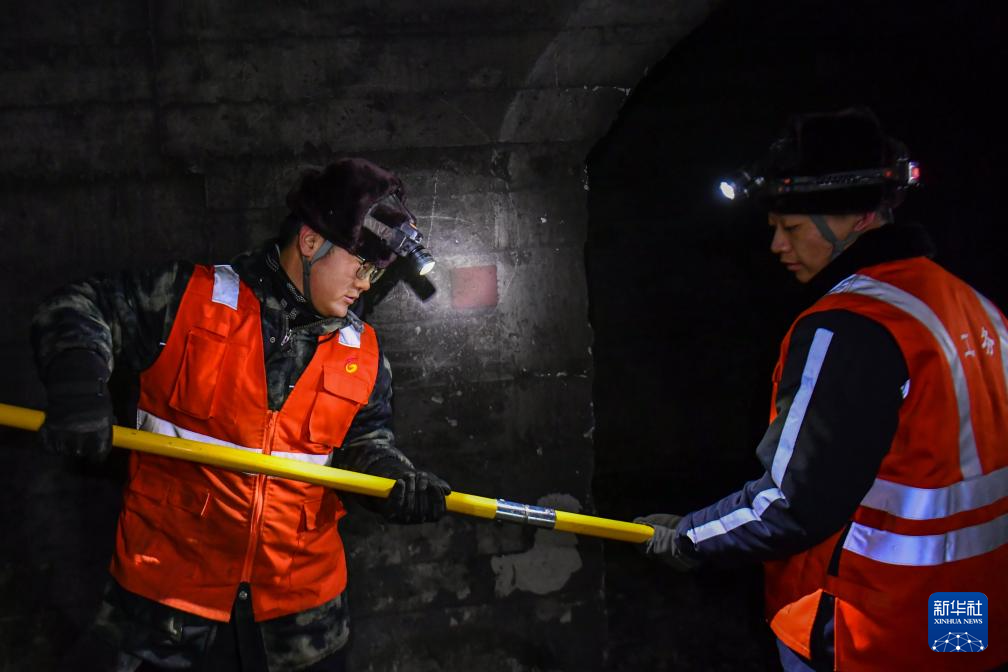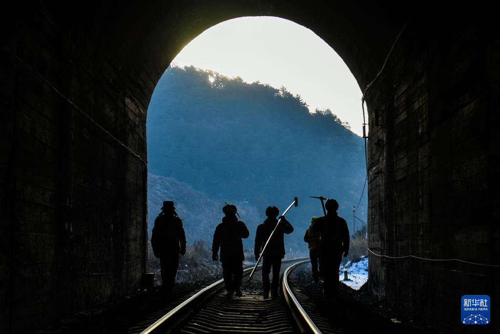 2月3日,中国铁路太原局集团有限公司太原工务段榆社桥隧车间的“打冰队”行走在隧道内。