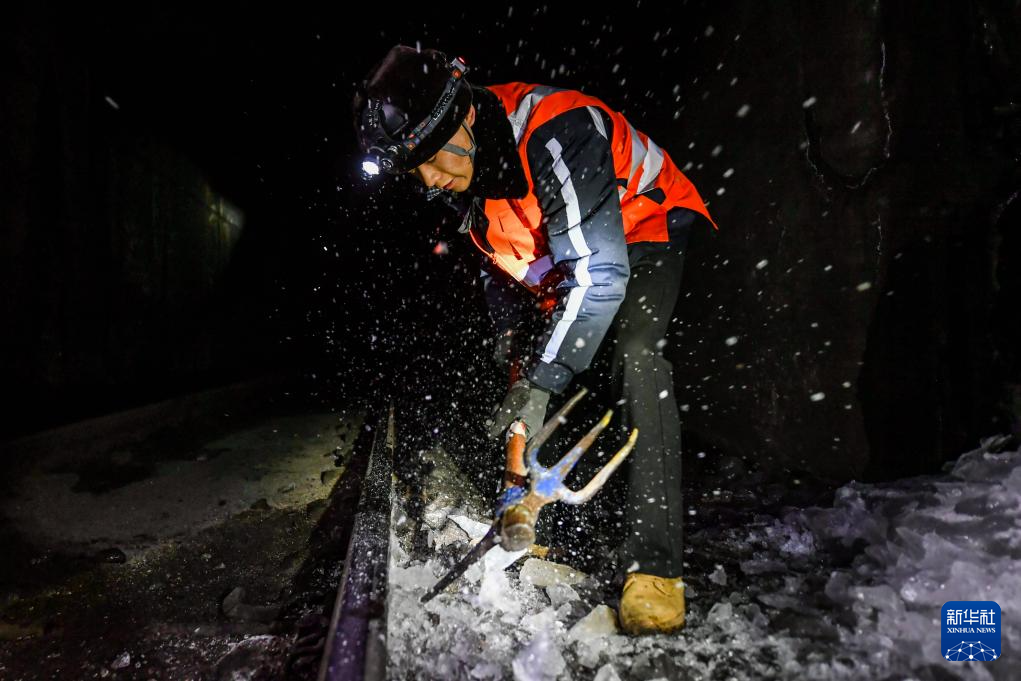 2月3日,桥隧工张瑞杰在隧道里打冰。