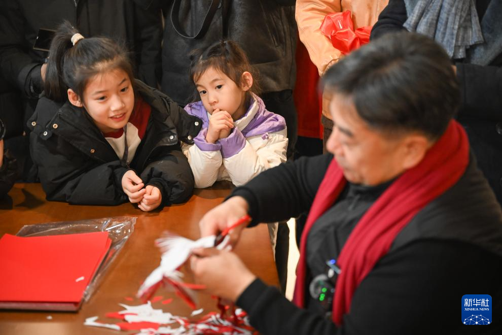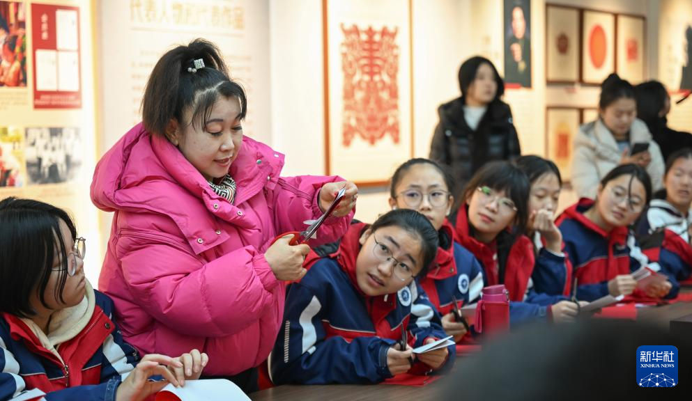 2月4日,学生们在内蒙古呼和浩特市和林格尔土城子国家考古遗址公园剪纸陈列馆交流剪纸技艺。