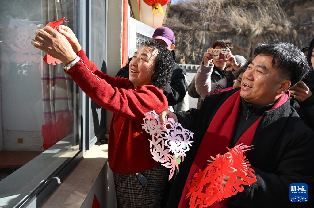 2月4日,在内蒙古呼和浩特市和林格尔县台格斗村,和林格尔剪纸国家级非物质文化遗产代表性传承人段建珺(前右)和村民一起贴窗花。