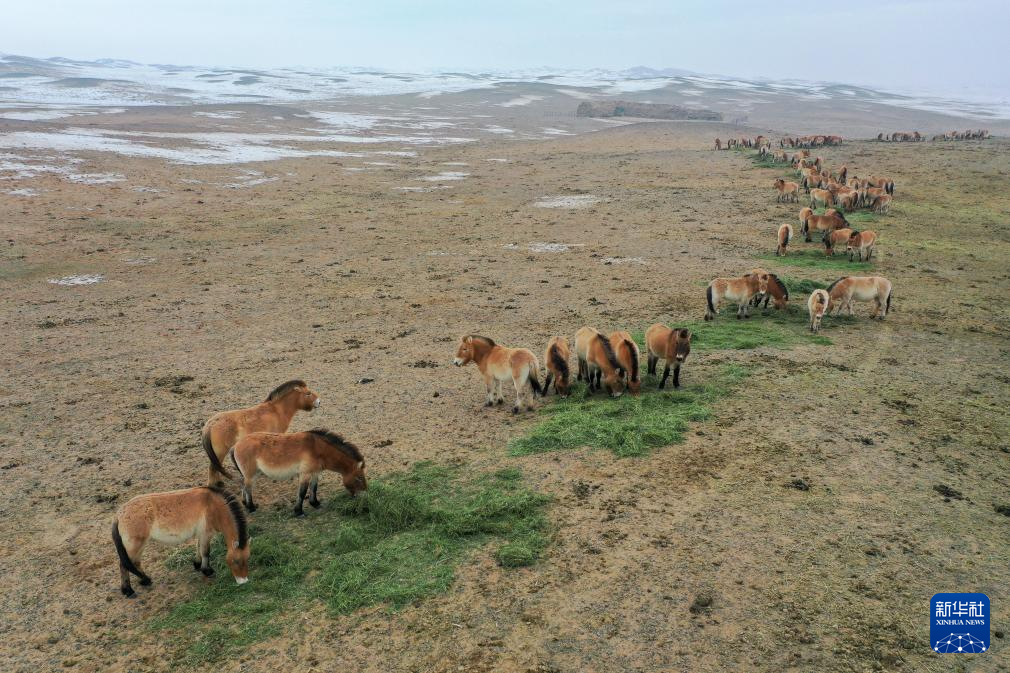这是在新疆卡拉麦里山有蹄类野生动物自然保护区管理中心乔木希拜普氏野马监测站拍摄的野马(2月4日摄,无人机照片)。