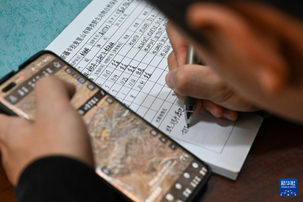 在新疆卡拉麦里山有蹄类野生动物自然保护区管理中心乔木希拜普氏野马监测站,管护员在登记巡护数据(2月4日摄)。
