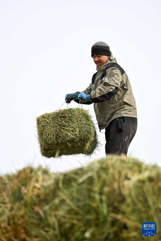 在新疆卡拉麦里山有蹄类野生动物自然保护区管理中心乔木希拜普氏野马监测站,管护员在搬运草料(2月4日摄)。