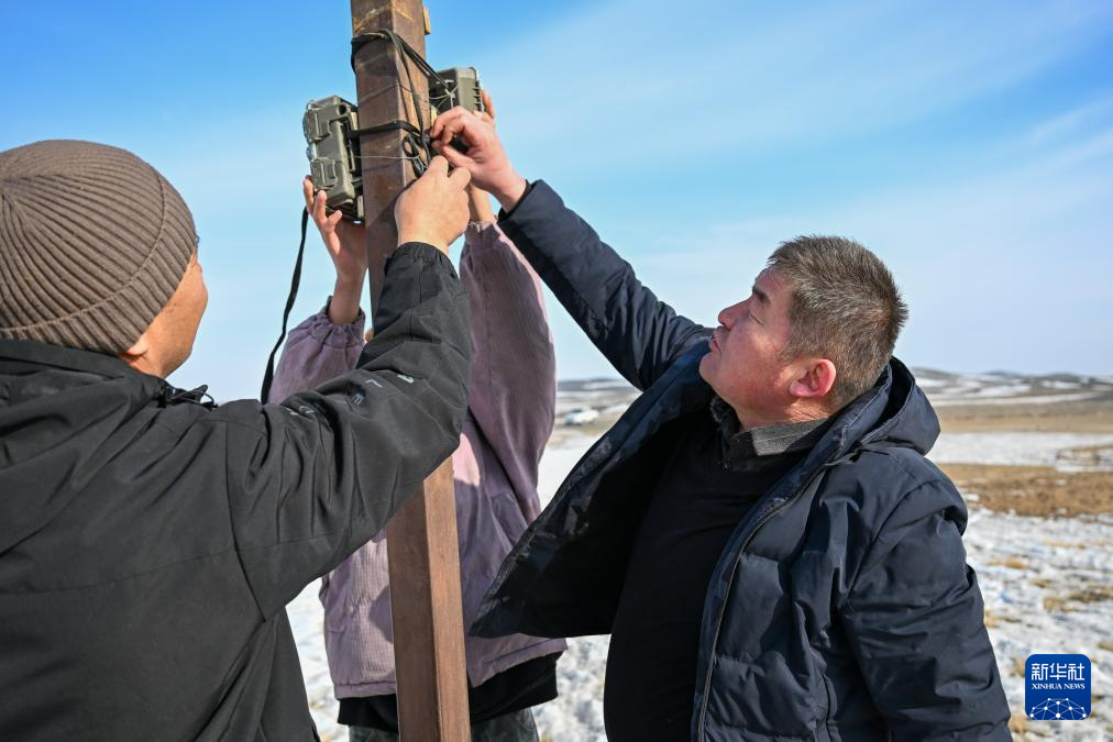 在新疆卡拉麦里山有蹄类野生动物自然保护区管理中心乔木希拜普氏野马监测站,管护员在更换红外相机电池和登记数据(2月4日摄)。