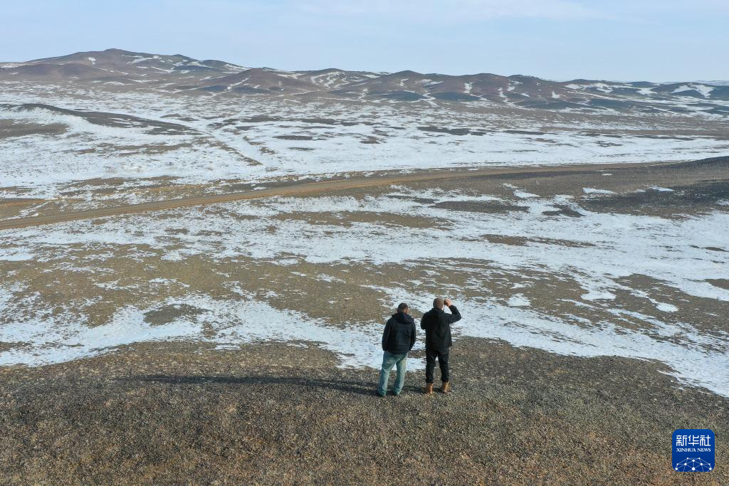 在新疆卡拉麦里山有蹄类野生动物自然保护区,乔木希拜普氏野马监测站的管护员在查看植被情况(2月4日摄,无人机照片)。