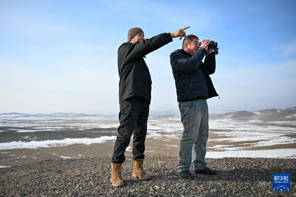 在新疆卡拉麦里山有蹄类野生动物自然保护区,乔木希拜普氏野马监测站的管护员在寻找野马的踪迹(2月4日摄)。