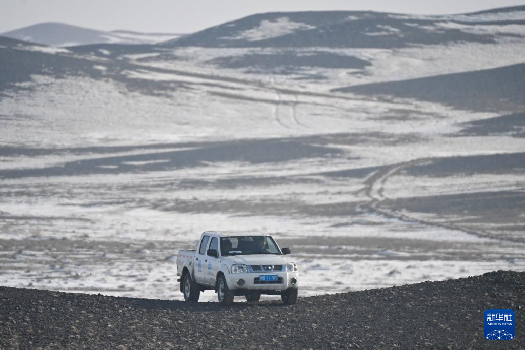 在新疆卡拉麦里山有蹄类野生动物自然保护区,管护员驾车寻找野马的踪迹(2月4日摄)。