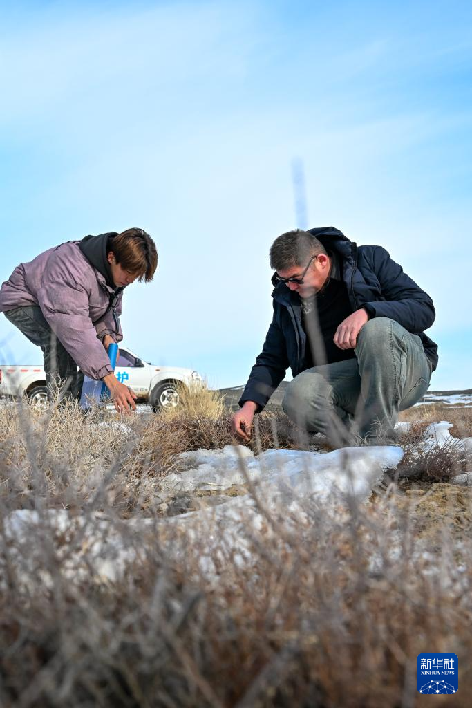 在新疆卡拉麦里山有蹄类野生动物自然保护区,乔木希拜普氏野马监测站的管护员在查看水源地结冰情况(2月4日摄)。