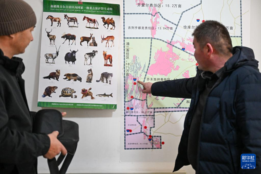 在新疆卡拉麦里山有蹄类野生动物自然保护区管理中心乔木希拜普氏野马监测站,管护员在制定当日的巡护路线(2月4日摄)。