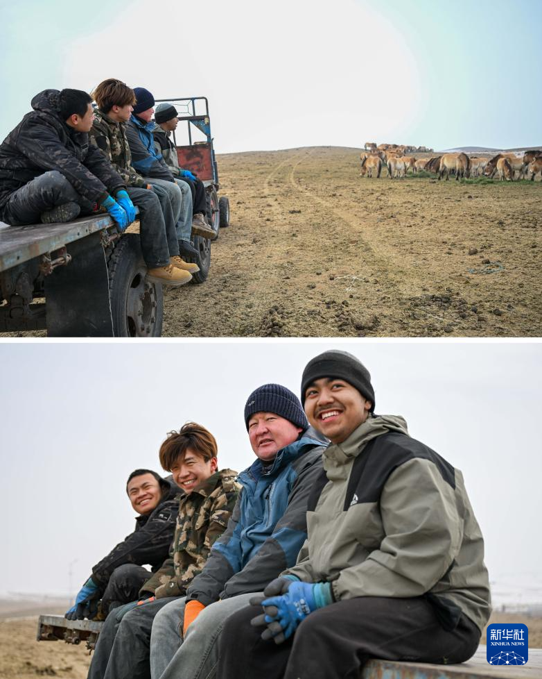 拼版照片:上图是乔木希拜普氏野马监测站的管护员观察野马进食情况(2月4日摄);下图是管护员在投喂完野马后坐在拖拉机上休息(2月4日摄)。